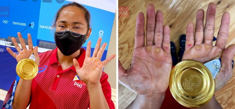 นักยกน้ำหนักหญิงฟิลิปปินส์กับฝ่ามือของเธอ.