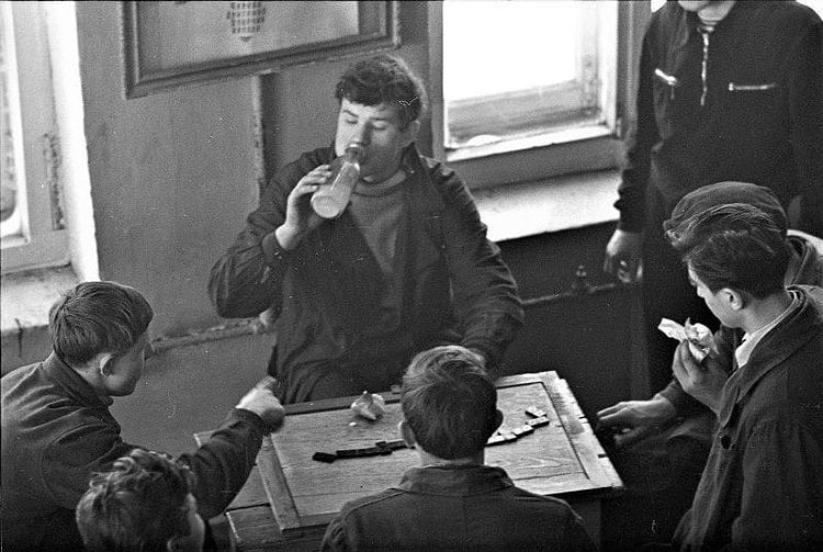 พนักงานโรงงานอุปกรณ์ประกอบสากลพักเที่ยงรับประทานอาหารใน มอสโกปี1960.