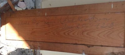 ผนังบ้านที่สร้างในปี1941พบป้ายช่างประปา เดิมที่มีหมายเลขโทรศัพท์ 4 หลัก.