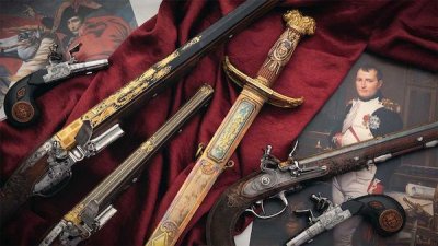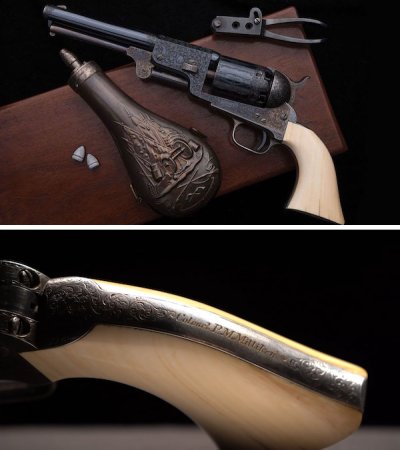 Colt 1849 Revolver $1.14M. ปืนลูกโม่ทองคำสลักหกอัน ที่ทำขึ้นให้เป็นของขวัญแก่ กษัตริย์แห่ง เดนมาร์ก และ สวีเดน .
