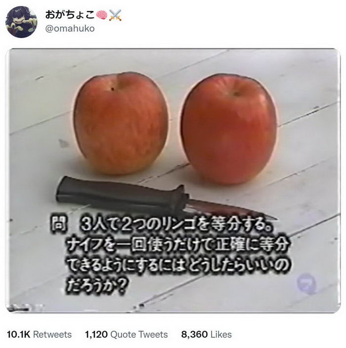 “คน 3 คนกำลังจะแบ่งแอปเปิ้ล 2 ลูก พวกเขาสามารถใช้มีดได้เพียงครั้งเดียวเท่านั้น พวกเขาจะแน่ใจได้อย่างไรว่าปริมาณแอปเปิ้ลที่ได้จะเท่ากันทั้งหมด”