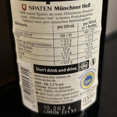 ฉลากบนขวดเบียร์ทั้งหมดเป็นตัวหนังสือภาษาเยอรมัน ยกเว้น " ห้ามดื่มแล้วขับ " เป็นภาษาอังกฤษ.