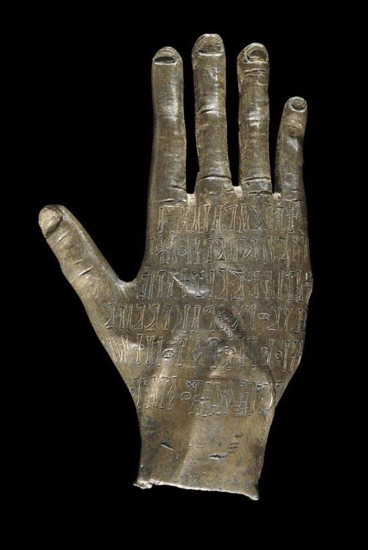 11. มือแกะสลักพร้อมจารึก บูชายัญแก่วิหารของเทพเจ้า Ta ' laba Ryam เยเมนโบราณ ที่ แคลิฟอร์เนีย ในศตวรรษที่สอง.