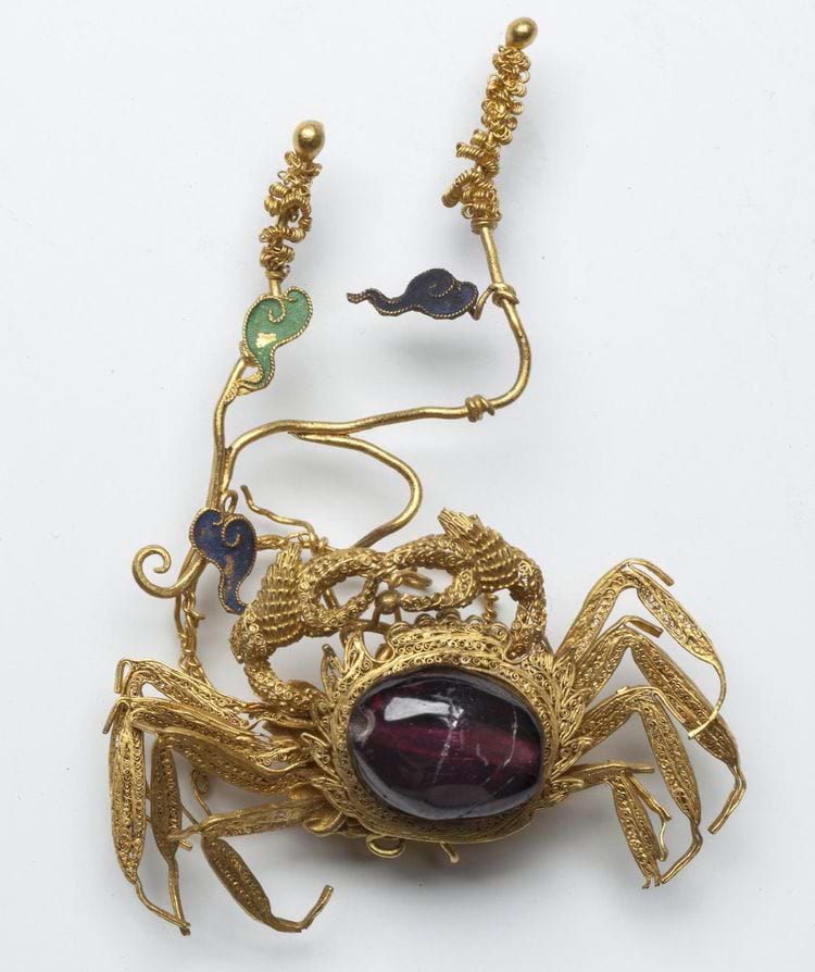 10. ประดับผมสีทอง เป็นรูปปูประดับด้วยหินอัลมันดีน ประเทศจีน ศตวรรษที่ XVll - XVlll .
