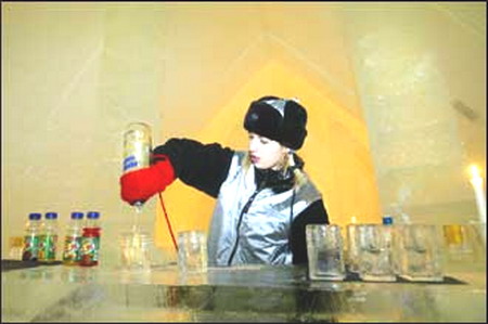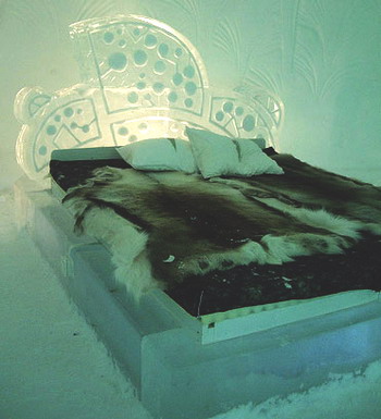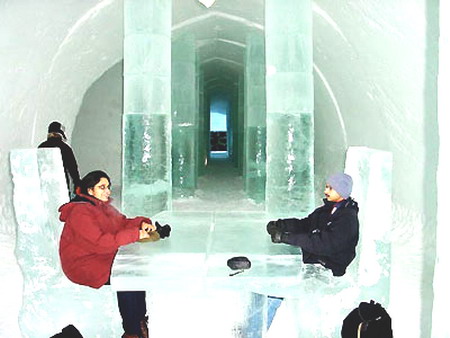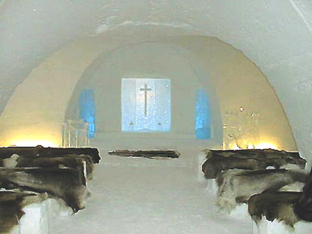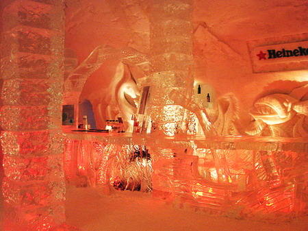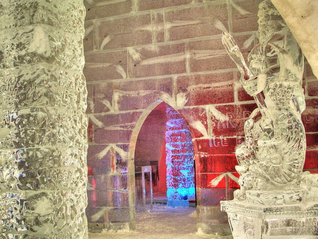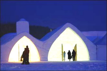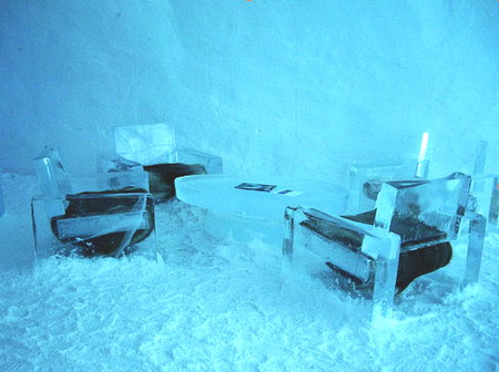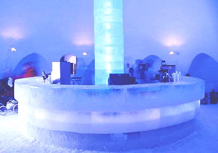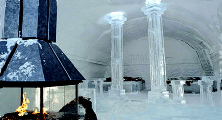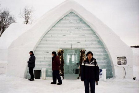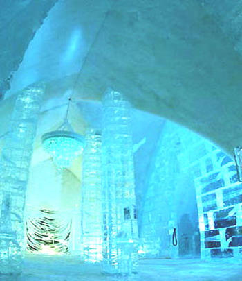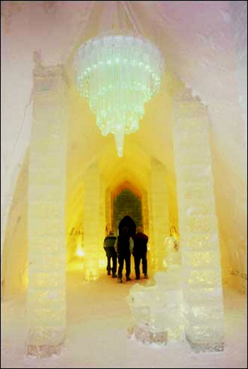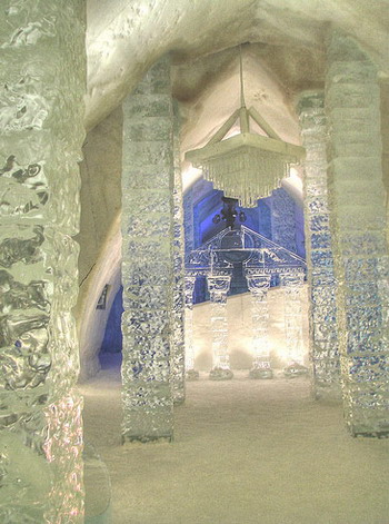 โรงแรมน้ำแข็ง เป็นโรงแรมที่ทำด้วยน้ำแข็งสมชื่อ และนับว่าเป็นสถาปัตยกรรมที่เป็นธรรมชาติมากที่สุดทีเดียว เพราะทำด้วยน้ำแข็งล้วนๆ แต่จะยั่งยืนหรือไม่นั้น ขึ้นอยู่กับอุณหภูมิเป็นสำคัญ ถ้าร้อนมาก ก็ละลายเร็วเป็นธรรมดา และเมื่อโรงแรมละลายไปในช่วงหน้าร้อน (ประมาณเดือนพฤษภาคม-พฤศจิกายน) ในช่วงฤดูหนาวเขาก็จะสร้าง igloo ยักษ์นี้ขึ้นมาใหม่ ทุกๆปี (การสร้างโรงแรมน้ำแข็งขึ้นนี้ ก็คงได้แนวความคิดมาจากกระท่อม igloo ของเอสกิโมนั่นเอง) เมื่ออากาศเริ่มเย็นจนได้ที่ในเดือนพฤศจิกายน และเปิดให้บริการได้ตั้งแต่เดือนมกราคมจนถึงเดือนเมษายน น้ำแข็งก็จะเริ่มละลายจนต้องปิดให้บริการประจำปี แต่ก็เป็นข้อดีอย่างหนึ่ง เพราะการสร้างใหม่ในปีต่อๆไป ก็จะมีการพัฒนารูปแบบให้ดีขึ้น และสวยงามขึ้น พร้อมทั้งเทคนิคการสร้างที่ก้าวหน้าขึ้นตามไปด้วย เพราะนอกจากห้องพักแบบต่างๆ 32 ห้องแล้ว ยังมีส่วนอำนวยความสะดวกที่โรงแรมทั่วไปเขามีกัน เช่น โรงหนัง ไนท์คลับ บาร์น้ำแข็ง แกลลอรี่และห้องแสดงนิทรรศการ และที่พิเศษที่สุดคือโบสถ์เล็กๆ สำหรับการแต่งงานอันสุดแสนเย็นยะเยือก รวมๆกันแล้ว ทั้งโรงแรม สามารถรองรับแขกทั้งหมดได้ถึง 400 คน ทีเดียว