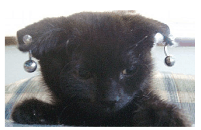 เทียบกับขนาดตัวของแมว โดยมีแมวอย่างน้อยหนึ่งตัวที่ถูกใช้หนังยางรัดหาง โดยมีจุด
