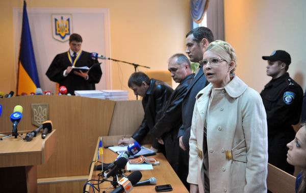 ยูลิยา ทีโมเชงโก ยืนเคียงข้างกับสามีและบุตรสาวต่อหน้าศาล และประณามคำพิพากษาโดยทันที ว่า ถูกประธานาธิบดี วิคเตอร์ ยานูโควิช ศัตรูคู่แค้นทางการเมืองของเธอ บงการ
