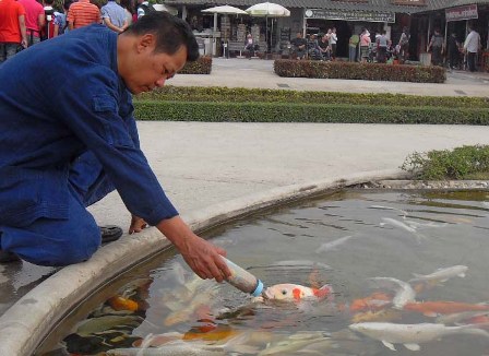 จากนั้นไม่นานนักก็จะมีฝูงปลาคาร์ฟจำนวนมากว่ายมาจากทั่วทุกที่ภายใน บ่อ ตรงไปหาอาจารย์เฉลิมชัย เพื่อเตรียมดูดนมจากขวดนมที่อาจารย์ถือไปด้วย