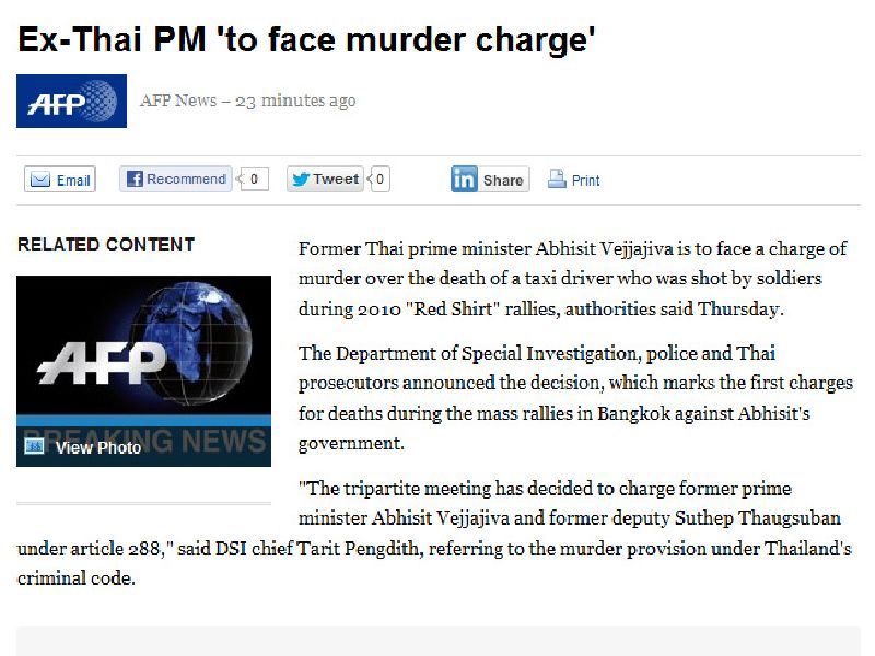 ด้านสำนักข่าวเอเอฟพี สื่อต่างประเทศชื่อดัง รายงานข่าวดังกล่าวไปทั่วโลกเช่นกัน โดยพาดหัวข่าวว่า "Ex-Thai PM ′to face murder charge′"