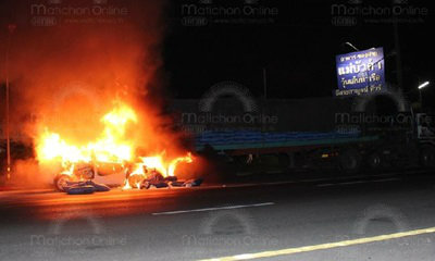 เมื่อเวลา 20.30 น. วันที่ 6 เมษายน ร.ต.ท.ชุมพล เหลืองเอี่ยม พงส.สภ.ท่าม่วง จ.กาญจนบุรี ได้รับแจ้งว่า เกิดอุบัติเหตุรถ 18 ล้อชนกับรถยนต์เก๋งเกิดไฟลุกไหม้ บนถนนแสงชูโตสายใหม่ขาเข้าตัวเมืองกาญจนบุรี หน้าร้านแม่บัวคำขายของฝาก หมู่ที่ 9 ต.วังศาลา อ.ท่าม่วง จึงรุดไปตรวจสอบ
