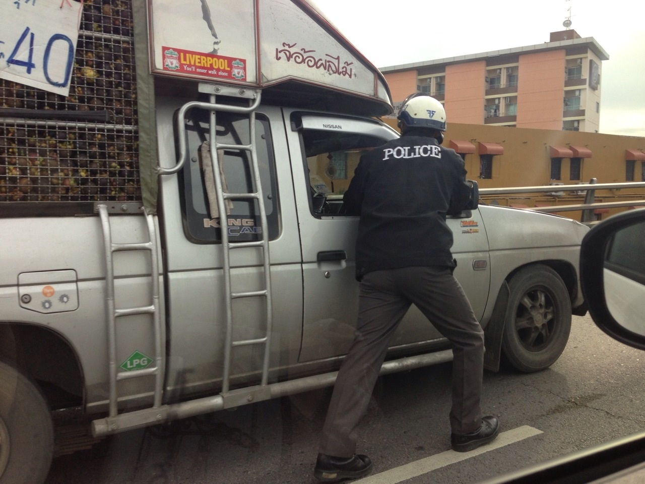 เมื่อสักครู่มีรถขายผลไม้(มังคุด/รถกระบะ) เกิดเสียบนสะพานยังไม่ถึงจุดสูงสุดของสะพาน