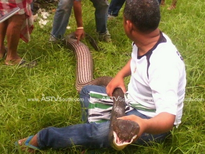 วันนี้ (30ก.ค.) เมื่อเวลา 11.00 น. ที่ผ่านมาชาวบ้านในพื้นที่ต.กำพวน อ.สุขสำราญ จ.ระนอง ได้พากันตื่นตกใจ และแห่ไปดูงูจงอางยักษ์ยาวเกือบ 5เมตร ที่นายอับดุล จำปาดะ ซึ่งเป็นหมองูสามารถจับได้ ภายหลังได้รับแจ้งจากชาวบ้านให้เข้าช่วยเหลือจับงูตัวดังกล่าว
