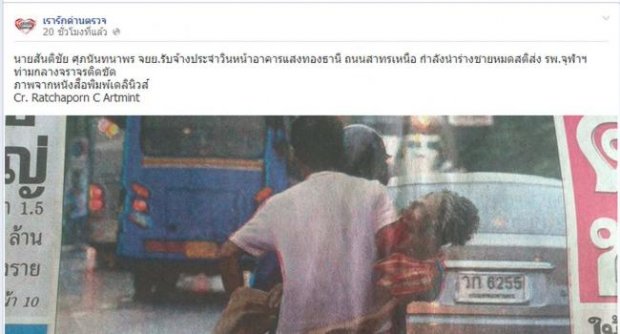 เมื่อเวลา 15.00 น. วันที่ 23 ก.ย. ผู้สื่อข่าวทำการตรวจสอบเพจของเว็ปไซด์ เฟซบุ๊ค ที่ใช้ชื่อว่า “เรารักด่านตำรวจ” พบว่ามีการแชร์รูปภาพ ที่มีชื่อว่า “น้ำใจ” จาก นสพ.เดลินิวส์ ฉบับวันอาทิตย์ที่ 22 ก.ย. ที่ผ่านมา ซึ่งเป็นภาพที่ผู้สื่อข่าวตระเวนข่าวอาชญากรรม นสพ. สามารถบันทึกไว้ได้ โดยมีการเขียนบรรยายระบุว่า “นายสันติชัย ศุภนันทนาพร จยย.รับจ้างประจำวินหน้าอาคารแสงทองธานี ถนนสาทรเหนือ กำลังนำร่างชายหมดสติส่ง รพ.จุฬาฯ ท่ามกลางการจราจรติดขัด Cr.Ratchaporn C Artmint” พร้อมทั้งมีการแชร์ส่งต่อ แสดงความคิดเห็น ชื่นชม ให้กำลังใจแก่ นายสันติชัย คนขับ วิน จยย. รับจ้าง และมีการวิพากษ์วิจารณ์ ซาบซึ้งถึงเหตุการณ์ดังกล่าว กันต่างๆนาๆ กันอย่างมากมาย มีบางราย แสดงความคิดเห็นว่า “สิ่งดีๆๆๆในสังคมก็ยังมีให้เห็นคับ” และ”ถ้าผมรวยและมีอำนาจผมจะให้รางวัลเค้า ไม่ได้ตีค่าความดีน้ำใจ ด้วยเงินนะครับ แต่เป็นกำลังใจให้คนทำความดี ให้รับเหรียญเกรียติยศ แก่พี่เค้าเลย” อีกด้วย