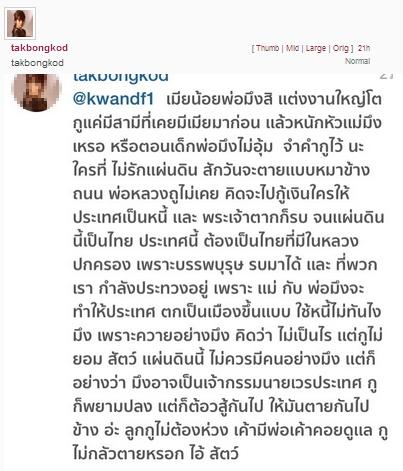 ขึ้นชื่อว่าเป็นสาวตรง ๆ แล้วมีหรือที่ ตั๊ก บงกช จะอยู่เฉย ๆ เมื่อมีคนริอาจเข้ามาว่าถึงในอินสตราแกรมส่วนตัวว่า "เป็นเมียน้อย" เรียกว่าเป็นการโพสต์ที่แรงและตรงจริง ๆ โดยในข้อความบางส่วนได้ระบุว่า ใครไม่รักแผ่นดินเกิด สักวันจะตายแบบหมาข้างถนน