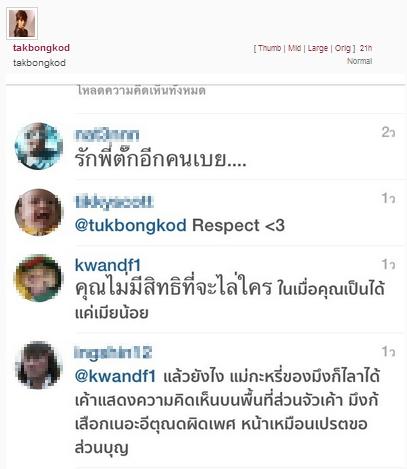 ซึ่งหลังจากที่ ตั๊ก ได้โพสต์ข้อความดังกล่าวลงไป มีคนเข้ามาแสดงความคิดเห็นกันเป็นอย่างมาก โดยส่วนใหญ่ให้กำลังใจคุณแม่ลูกอ่อนโดยบอกว่าให้ปล่อยคนคนนี้้ไปอย่าไปใส่ใจ