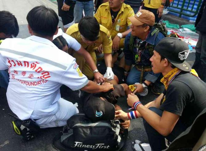 ผู้สื่อข่าวรายงานว่า ที่เวทีอนุสาวรีย์ชัยสมรภูมิ เมื่อเวลา 13.25 น. วันที่ 19 ม.ค. ได้มีเสียงคล้ายระเบิดดังขึ้น 2 ครั้งทำให้ผู้คนวิ่งหนีกระเจิดกระเจิง โดยลูกหนึ่งไปตกอยู่แถวที่บริเวนหน้าโรงพยาบาลราชวิถี ฝั่งที่จะไปทางโรงพยาบาลเด็ก แต่ยังไม่ทราบรายละเอียดว่าเกิดมาจากสาเหตุใด และการระเบิดครั้งนี้ทำให้เกิดมีผู้บาดเจ็บส่วนใหญ่เป็นพ่อค้า แม่ค้า ที่ขายเสื้อของกลุ่มผู้ชุมนุม โดยได้นำผู้ที่ได้รับบาดเจ็บส่งไปรักษาตัวที่โรงพยาบาลราชวิถี พระมงกุฎและรามาแล้ว มีข่าวแจ้งว่า 1 ในผู้ที่ได้รับบาดเจ็บน่าจะเป็นนักข่าวด้วย .