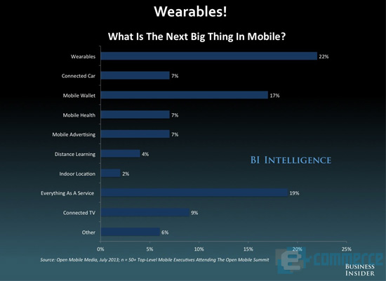 สุดท้ายกับแว่นตาไฮเทคที่ได้รับการบุกเบิกโดย Google Glass ซึ่ง BI Intelligence ได้ทำนายว่าภายในปี 2018 จะมีอุปกรณ์ลักษณะนี้วางขายถึง 21 ล้านหน่วยต่อปี แต่อุปสรรคที่ต้องก้าวข้ามไปให้ได้นั่นก็คือ ราคาขาย เพราะด้วยราคาที่ Google ตั้งไว้ที่ 1,500 เหรียญสหรัฐ (ราว 48,000 บาท) นั้นนับว่าสูงมาก อีกทั้งผู้ผลิตยังต้องพัฒนาเครื่องมือที่เอื้อต่อการพัฒนาแอพพลิเคชั่นเพิ่ม รวมทั้งโอกาสและช่องทางในการหารายได้ด้วย เพราะจากการใช้งานที่ต้องสวมใส่อยู่ตลอดเวลานั้นจะให้โฆษณาโผล่อยู่ตลอดเวลาคงไม่เป็นผลดีแน่ แต่ที่สำคัญที่สุดก็คือ ต้องชักชวนให้ผู้บริโภคยอมรับและนำเสนอคุณค่าด้านการออกแบบให้เป็นเสมือนสินค้าแฟชั่น เพราะสิ่งที่แว่นตาแตกต่างจากอุปกรณ์สวมใส่อื่นก็คือ สามารถเห็นได้ชัดเจนและส่งผลต่อภาพลักษณ์ของผู้สวมใส่ได้ ที่ผ่านมา Google Glass ได้รับการครหาว่าเป็นของเล่นของพวกเนิร์ด เพราะใส่แล้วดูเหมือนหุ่นยนต์จากนิยายวิทยาศาสตร์มากกว่าจะนำมาใช้ประโยชน์ได้จริง นอกจากนั้นก็ยังมีปัญหาการรุกล้ำความเป็นส่วนตัวจากการถูกแอบถ่าย และความปลอดภัยขณะใช้งานโดยเฉพาะขณะขับรถ