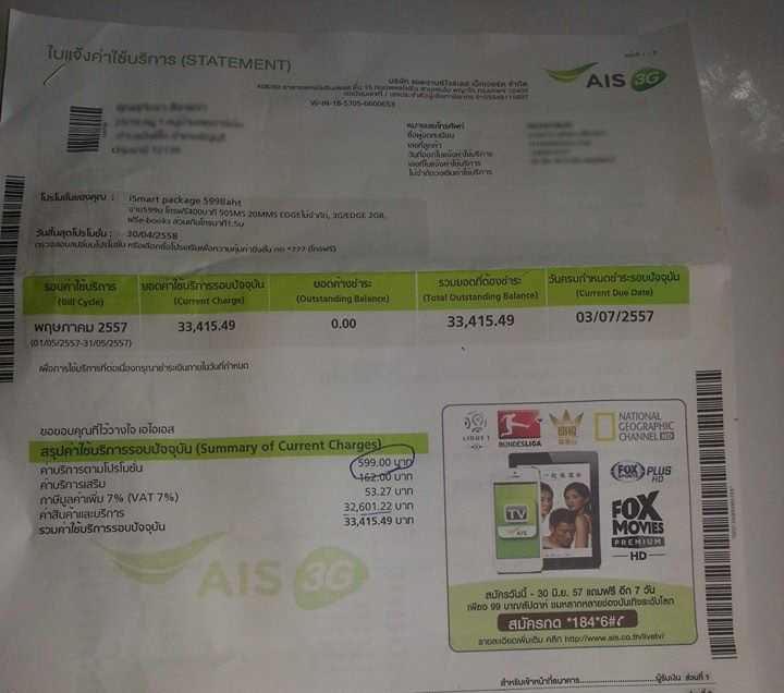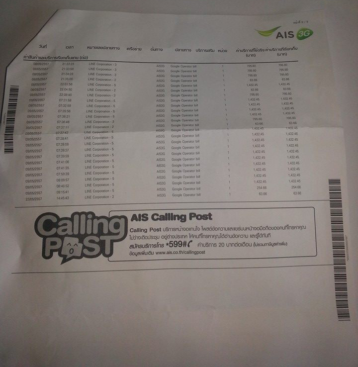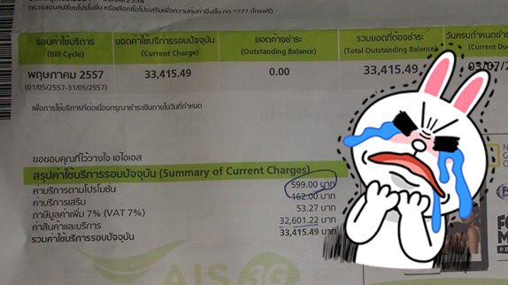 มีการโพสใบเรียกเก็บค่าบริการรายเดือนของ ais สุดช็อค ผ่านทางเว็บ Job-108 กับค่าใช้บริการเพียงรอบเดือนเดียว 33,415.49 บาท กับยอดการใช้งานที่ทะลุจากโปรโมชั่นรายเดือน 599 บาท และมีส่วนที่แจ้งรายละเอียดสำหรับการใช้งานที่เพิ่มขึ้นมาว่าเกิดจากซื้อไอเทมจากภายในเกมส์ Cookies Run จากทางค่าย LINE เป็นจำนวนหลายครั้ง