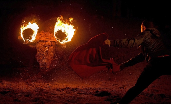 โดยการจับกระทิงมาขึงไว้ที่เสา จากนั้นทาตัวกระทิงด้วยโคลน เพื่อป้องกันไม่ให้ไฟเผาไหม้ตัวกระทิง แล้วจึงนำไม้ไปพาดไว้บริเวณเขากระทิง จากนั้นจึงจุดไฟ เท่านั้นยังไม่พอ เพราะเมื่อหัวของกระทิงกำลังลุกไปด้วยไฟนั้น ชายชาวสเปนที่ถือว่าเป็นผู้กล้าหาญก็จะนำผ้าแดงมาล่อให้กระทิงวิ่งไล่ตาม สร้างความสุนกสนาน และตื่นเต้นเร้าใจให้กับผู้คนที่ไปชมมากมาย