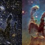 ส่วนของเนบิวลาที่เราเห็นอยู่นี้ถูกเรียกว่า “เสาแห่งการก่อกำเนิด” (Pillars of Creation) ซึ่งเป็นจุดที่มีเมฆหมอกโมเลกุลความหนาแน่นสูงมาก และเป็นแหล่งกำเนิดดาวฤกษ์อีกด้วยครับ