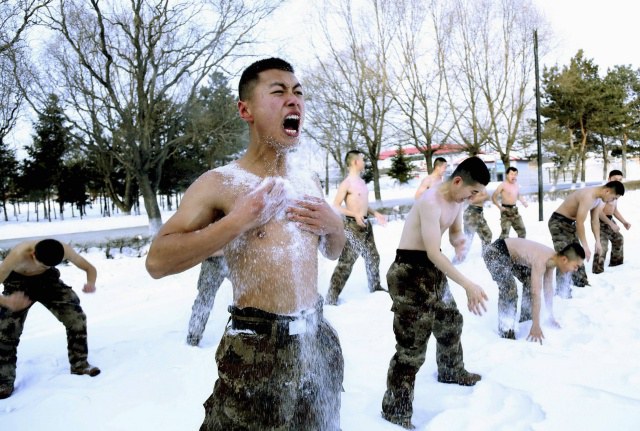 นายทหารหนุ่มของกองทัพปลดแอกประชาชน (PLA) ของจีน สาดหิมะเข้าใส่ร่างกายตัวเองระหว่างปฏิบัติการฝึกซ้อมช่วงฤดูหนาว ที่ระดับอุณหภูมิลดต่ำติดลบกว่า 30 องศาเซลเซียส ในนครเฮยเหอ มณฑลเฮยหลงเจียงทางภาคตะวันออกเฉียงเหนือของประเทศ (20 ม.ค. 2558 - รอยเตอร์ส)