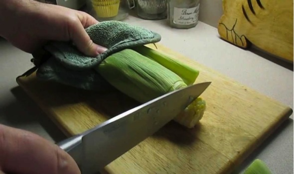 4.) จับส่วนปลายด้านบนด้วยถุงมือจับกันความร้อน และเขย่าจนข้าวโพดหลุดออกมาจากฝัก