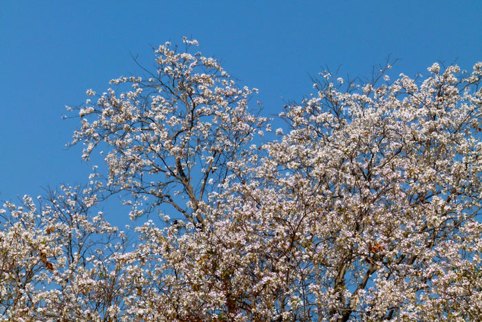 เสี้ยวหลายต้นออกดอกสีขาวนวลตระหง่านแทรกแซมไปในสีเขียวและสีแล้งแห่งขุนเขาป่าแจ้ซ้อน มองเห็นขาวเด่นมาแต่ไกลดูสะดุดตา