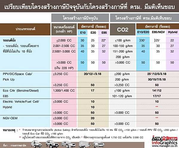 “ภาครัฐให้เวลาผู้ประกอบการในเตรียมตัวนาน 3 ปี จึงน่าจะสามารถปรับตัวรับโครงสร้างภาษีใหม่ได้ ซึ่งหากบริษัทที่สามารถดำเนินการให้รถปล่อยก๊าซ CO2 ตามมาตรฐานกำหนด พร้อมกับติดตั้งความปลอดภัยอย่างระบบเบรก ABS และระบบควบคุมการทรงตัว หรือ VSC จะเสียภาษีในอัตราเท่าปัจจุบัน หรือรถที่มีเครื่องยนต์ขนาดใหญ่จะได้รับการสนับสนุนภาษีลดลงสูงสุด 5% หากมีค่าการปล่อยมลพิษตามเกณฑ์ แต่ถ้าไม่สามารถทำได้จะต้องเสียภาษีเพิ่มจากเดิม 2-40% แล้วแต่ประเภทรถและฐานราคาของรถรุ่นนั้นๆ หรือตั้งแต่ระดับ 5,000 บาท ไปจนถึงมากกว่าแสนบาทขึ้นไป”