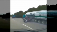 เกือบไม่รอดผ้าคลุมหล่นใส่ จนเสียหลักไปเบียดรถบรรทุกน้ำมัน