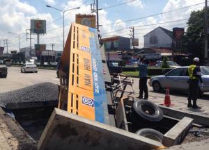 รถพ่วงตกบ่องานขุดเจาะถนน รามอินทรา 21 ล่าสุดยกท้ายรถขึ้นมาได้แล้ว