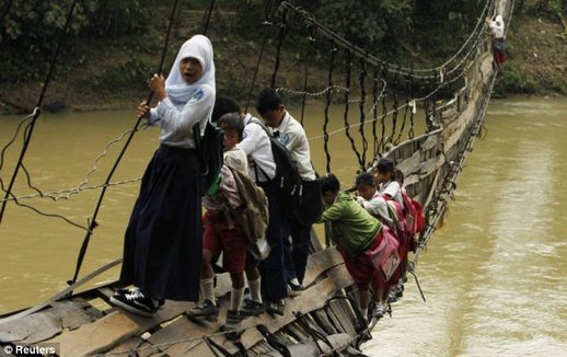 สุดหวาดเสียว นร.อินโดนีเซียยอมเสี่ยงตายไต่สะพานพังข้ามแม่น้ำเพื่อไปโรงเรียน