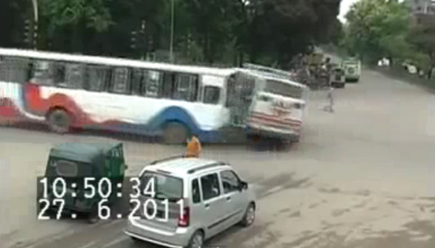 รอดหวุดหวิด!! รถเล็กทะลุกลาง ระหว่างรถบัส 2 คันชนกัน