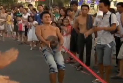 คลิปสุดทึ่ง! หนุ่มจีนใช้หม้อเหล็กติดท้องลากรถยาวกว่า 20 เมตร